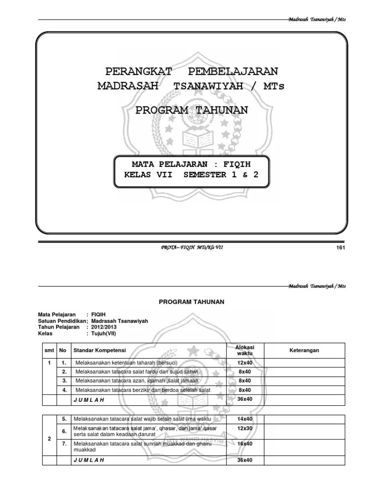 Fiqih di jenjang mts (madrasah tsanawiyah) kelas 9 (ix) kurikulum 2013 (k13) . Menghargai dan menghayati akhlak (adab) yang baik dalam beribadah dan berinteraksi dengan diri sendiri, keluarga, . Perangkat pembelajaran berupa program tahunan mapel fiqih tingkat smp/mts khusunya kelas vii semester 1 dan 2 kurikulum 2013 tahun . Download prota promes fiqih mts kurikulum 2013 revisi edisi revisi. Program tahunan dan program semester untuk tahun pelajaran 2019/2020.