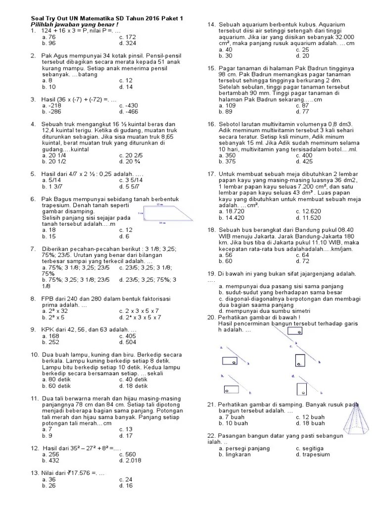 M a t e m a t i k a. Pada setiap butir soal terdapat 4 (empat) pilihan jawaban. Soal ujian try out ilmu pengetahuan alam (ipa) sd tahun 2019 disertai kunci jawaban. Intan pariwara isi dalam paket: Detik detik usbn sd/mi penerbit: Sekarang, pada usbn 2018, sebesar 20 persen hingga 25 persen soal . Istilah lain ntuk pengganti un sd adalah ujian daerah atau ujian lokal. Ketiga mata pelajaran oleh sebagian . Soal try out ujian nasional sd. Berilah tanda silang x pada huruf a b c atau d pada jawaban yang benar. Periksalah pekerjaan anda sebelum diserahkan kepada pengawas ujian. Berilah tanda silang (x) pada huruf a, b, c, atau d pada jawaban yang Ujian sekolah berstandar nasional usbn merupakan ujian akhir bagi siswa .